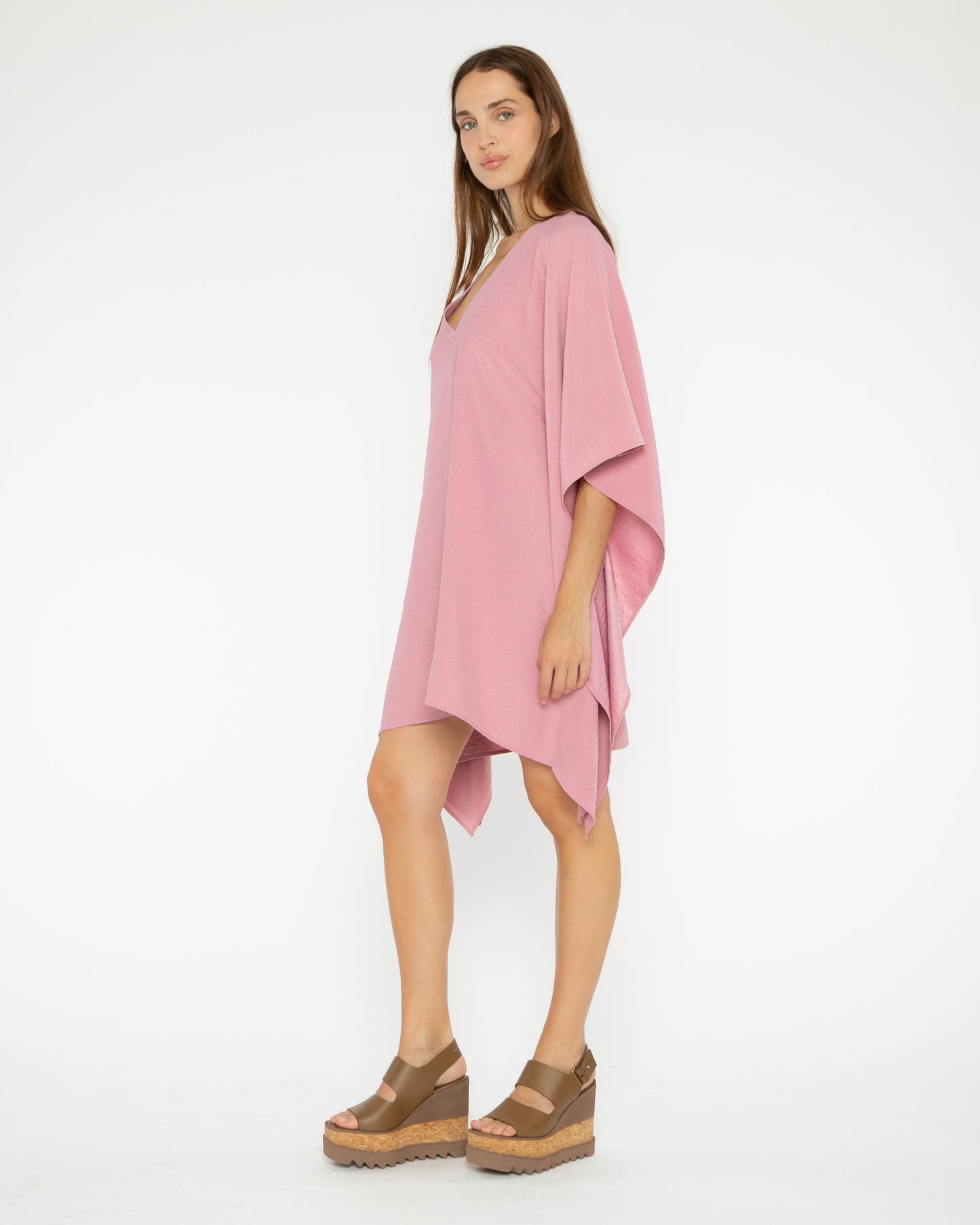 The shorter version of our Caftan Dress. 34" length. Wrinkle-free satin crepe fabric. Caftan is perfect for entertaining by the beach or entertaining at home. Effortless. Stunning.