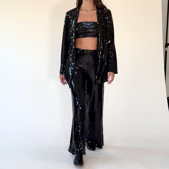 With its relaxed, modern fit and refined shoulder structure, it’s the ultimate holiday layering piece—perfect over our Sequin Bandeau Top and Sequin Wide Leg Pant for a coordinated, head-turning set.