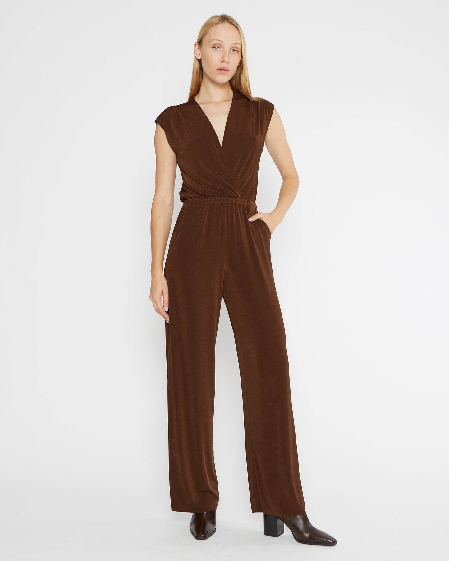 The classic Ripley Rader jumpsuit. Draped, slinky with gathered elastic waist and deep pockets. Gathered shoulders and an optional plunging neckline. (Fabric can be cinched at the waist to determine the drape). Laser-cut sleeves and hem create the sleek look we all crave. Wrinkle-free.