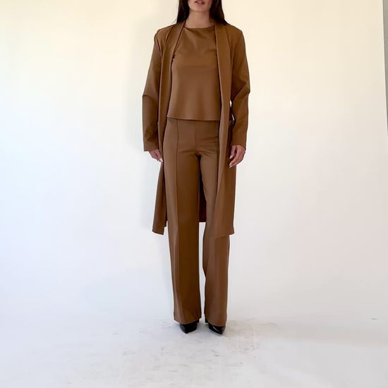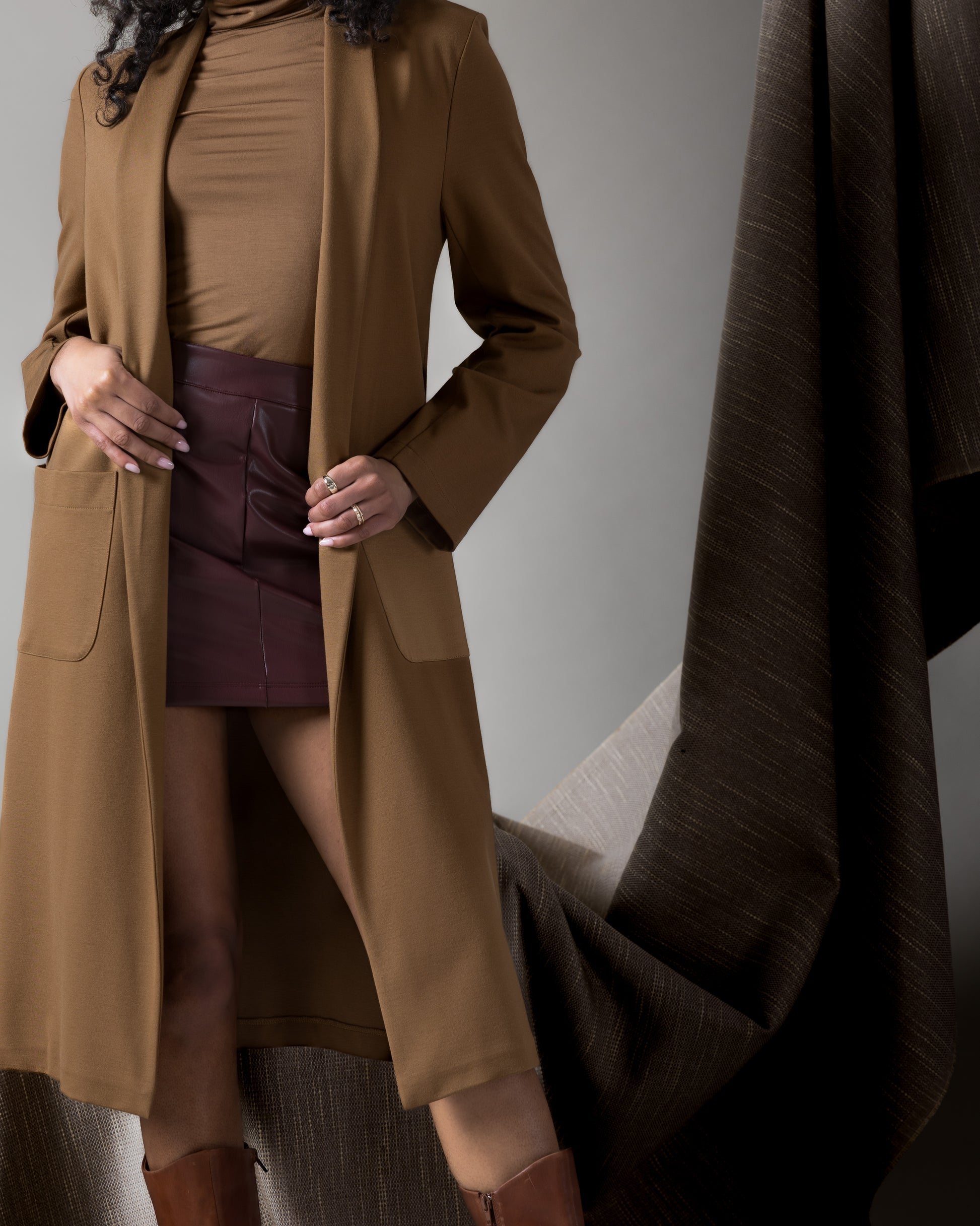 Featuring self-lined lapels, deep functional pockets, and a relaxed open front, it’s the chic alternative to a traditional duster. Perfect layered over fitted tanks or paired with wide-leg or straight-leg pants for a clean, elongated look.