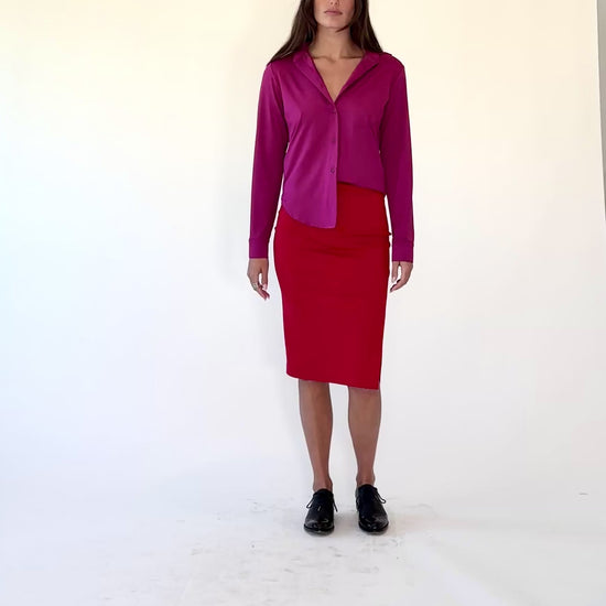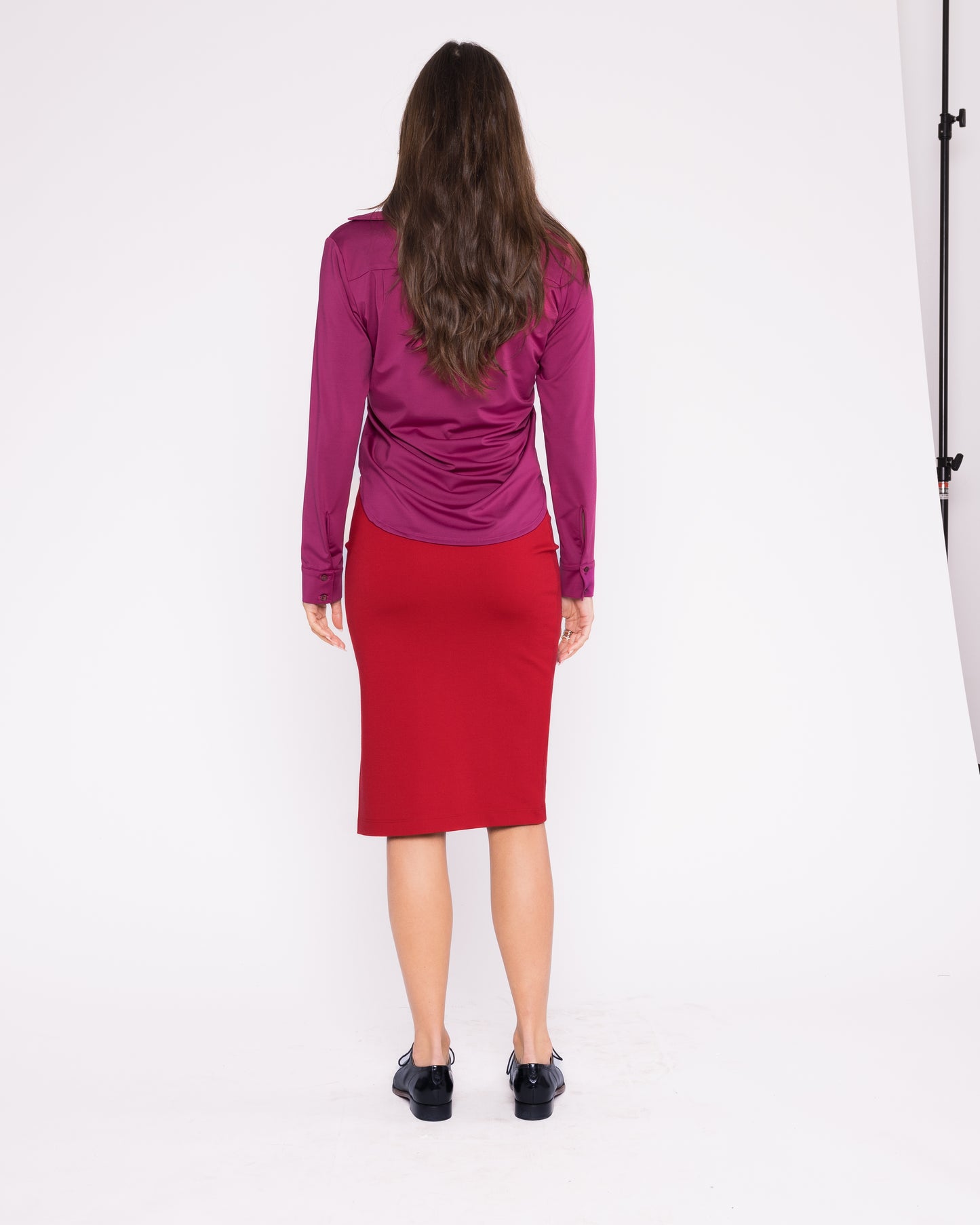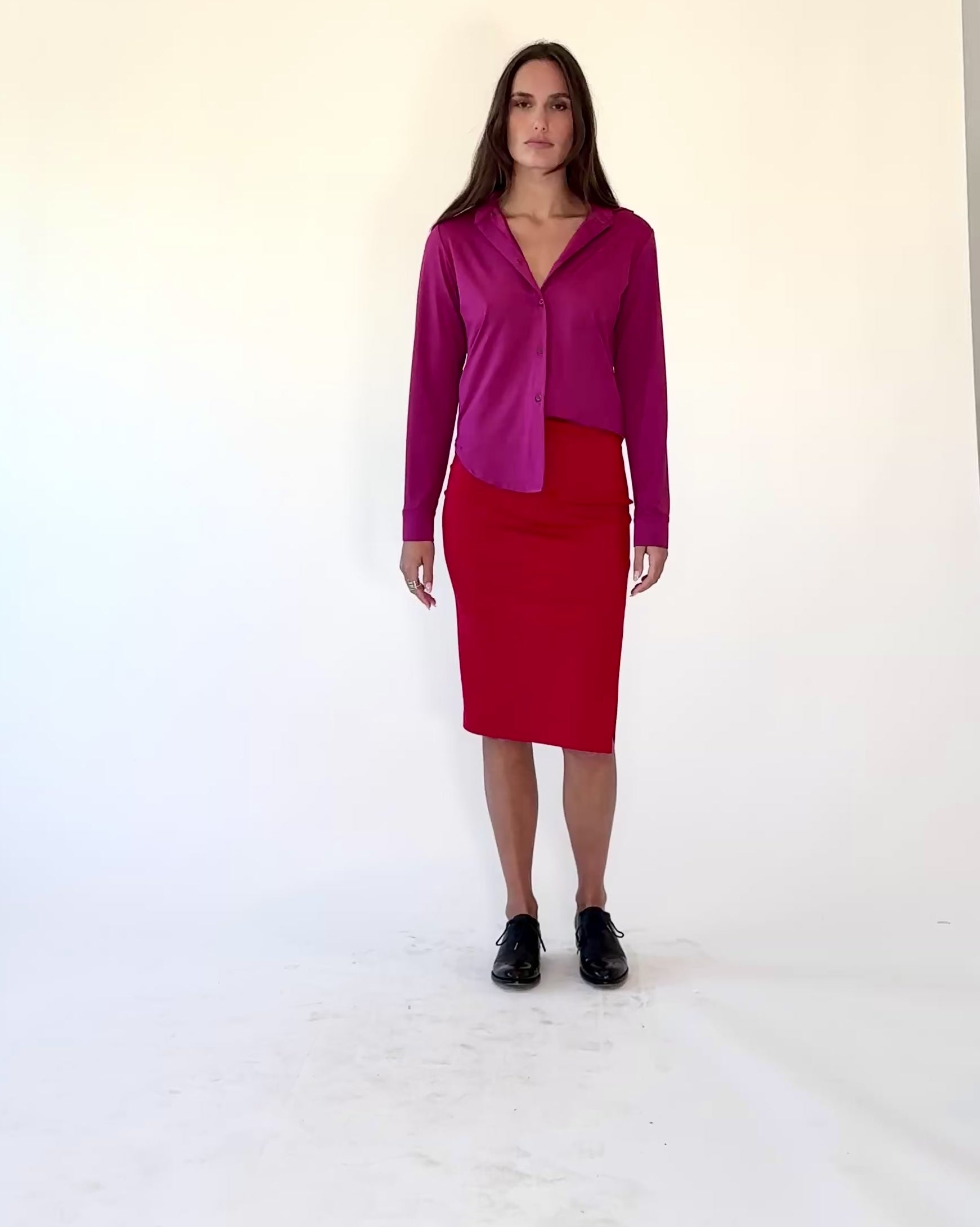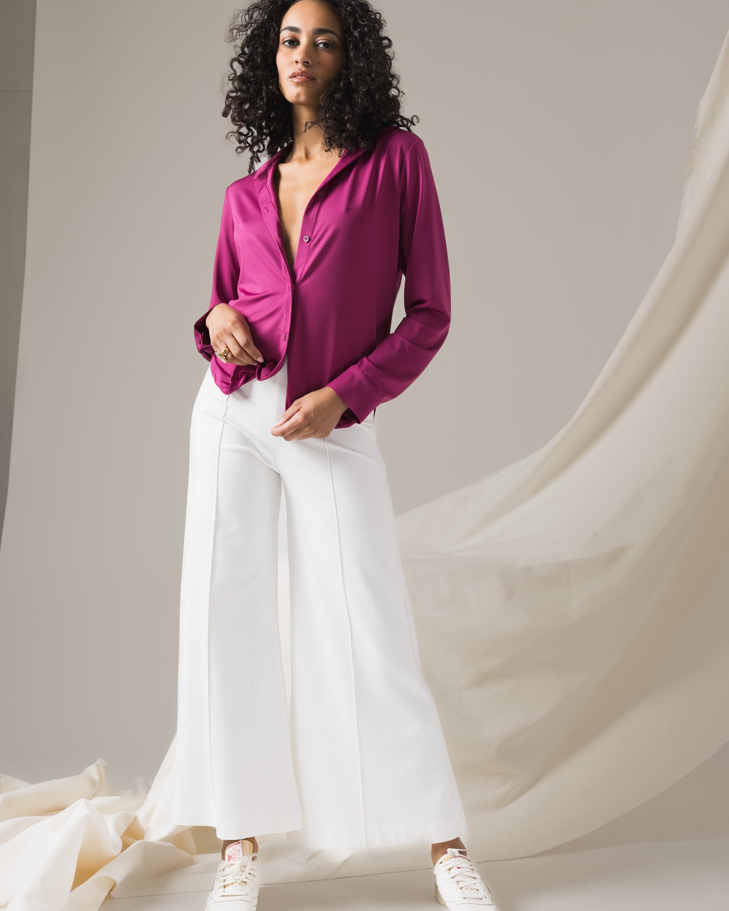 Soft sheen, effortless versatility. Crafted from luxurious jersey with a subtle, light-catching finish, this button-down drapes with fluid ease while offering just enough structure for polish. Silky-soft and endlessly comfortable, it transitions seamlessly from work to weekend.