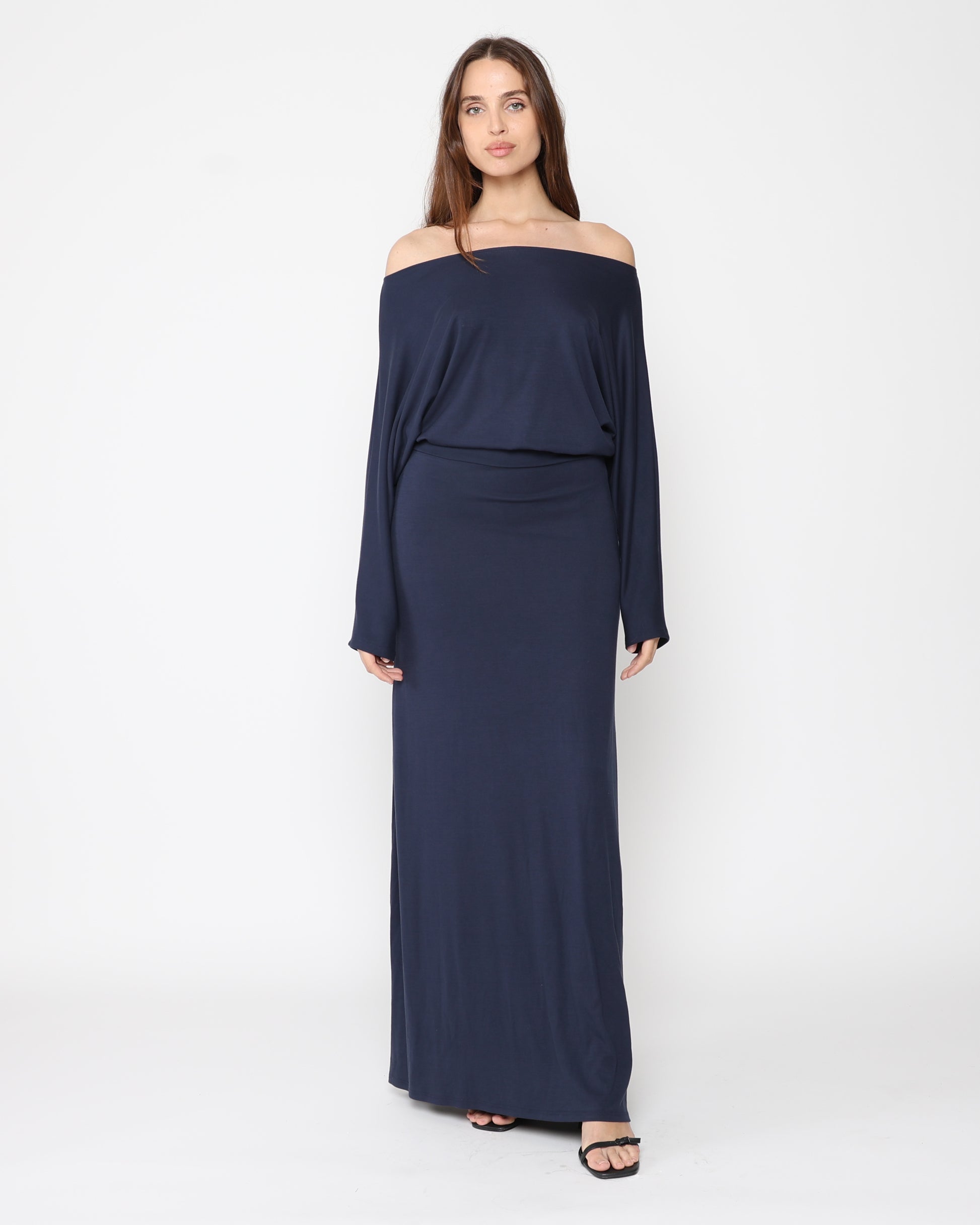 Unbothered. Undone. Unmistakably cool. This throw-on-and-stun silhouette is crafted from luxurious jersey that drapes and flows like liquid. The long, fluid cut and minimalist lines create a modern shape that feels as effortless as it looks.