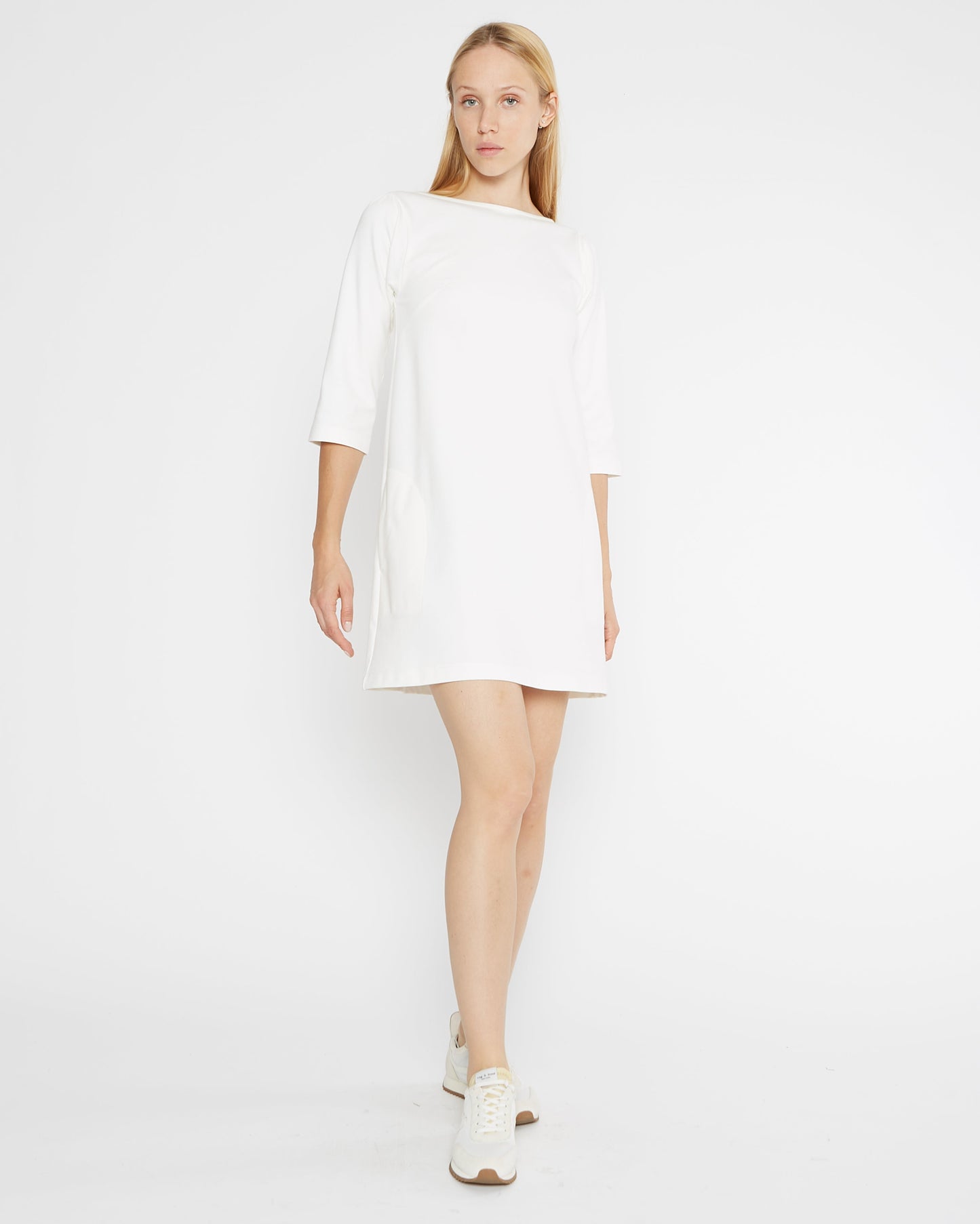 Effortless shape, everyday chic. Timeless and versatile, this dress features a softly tailored A-line silhouette with ¾-length sleeves, a wide neckline, and a flattering above-the-knee length.