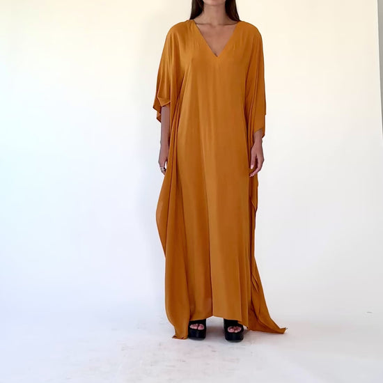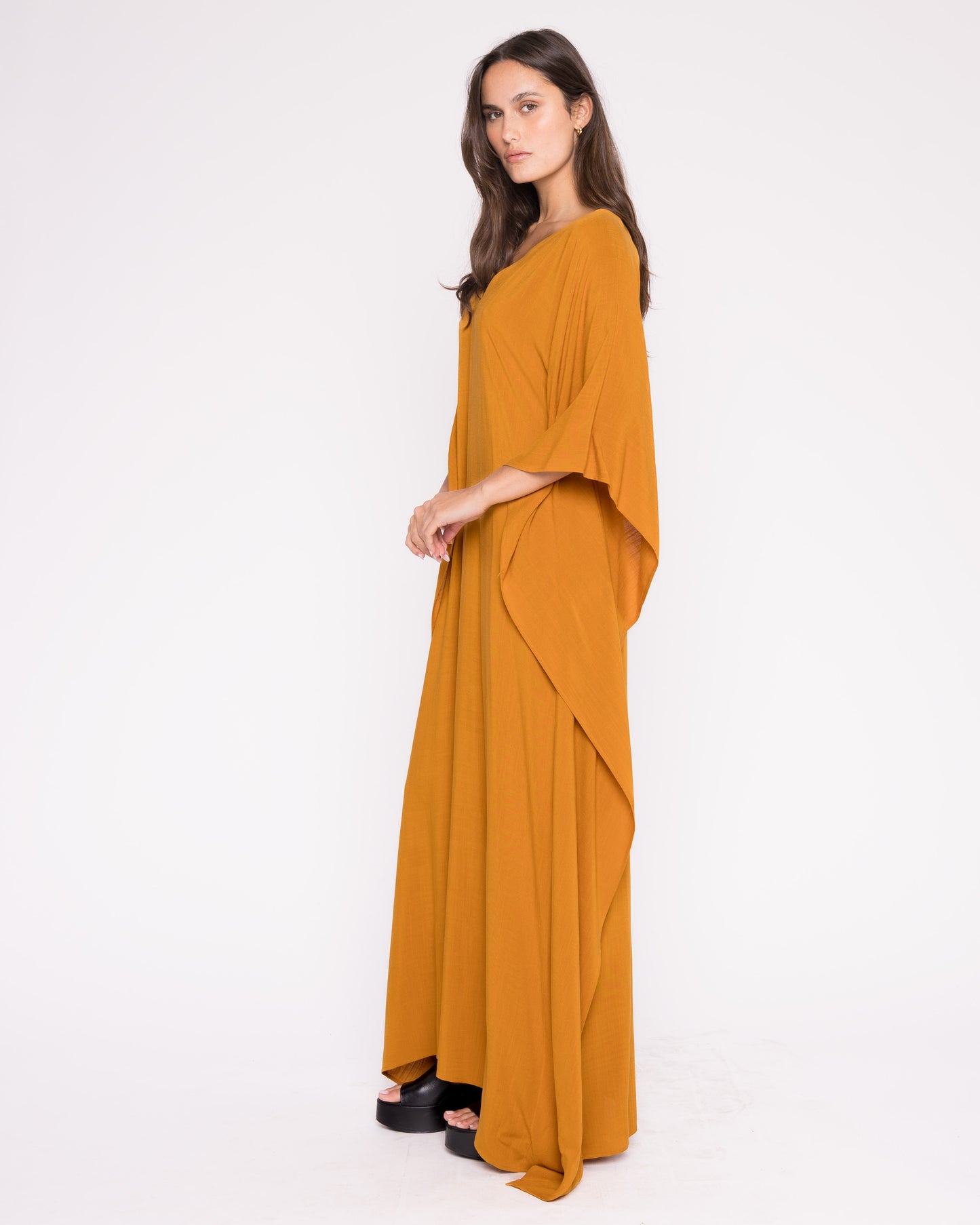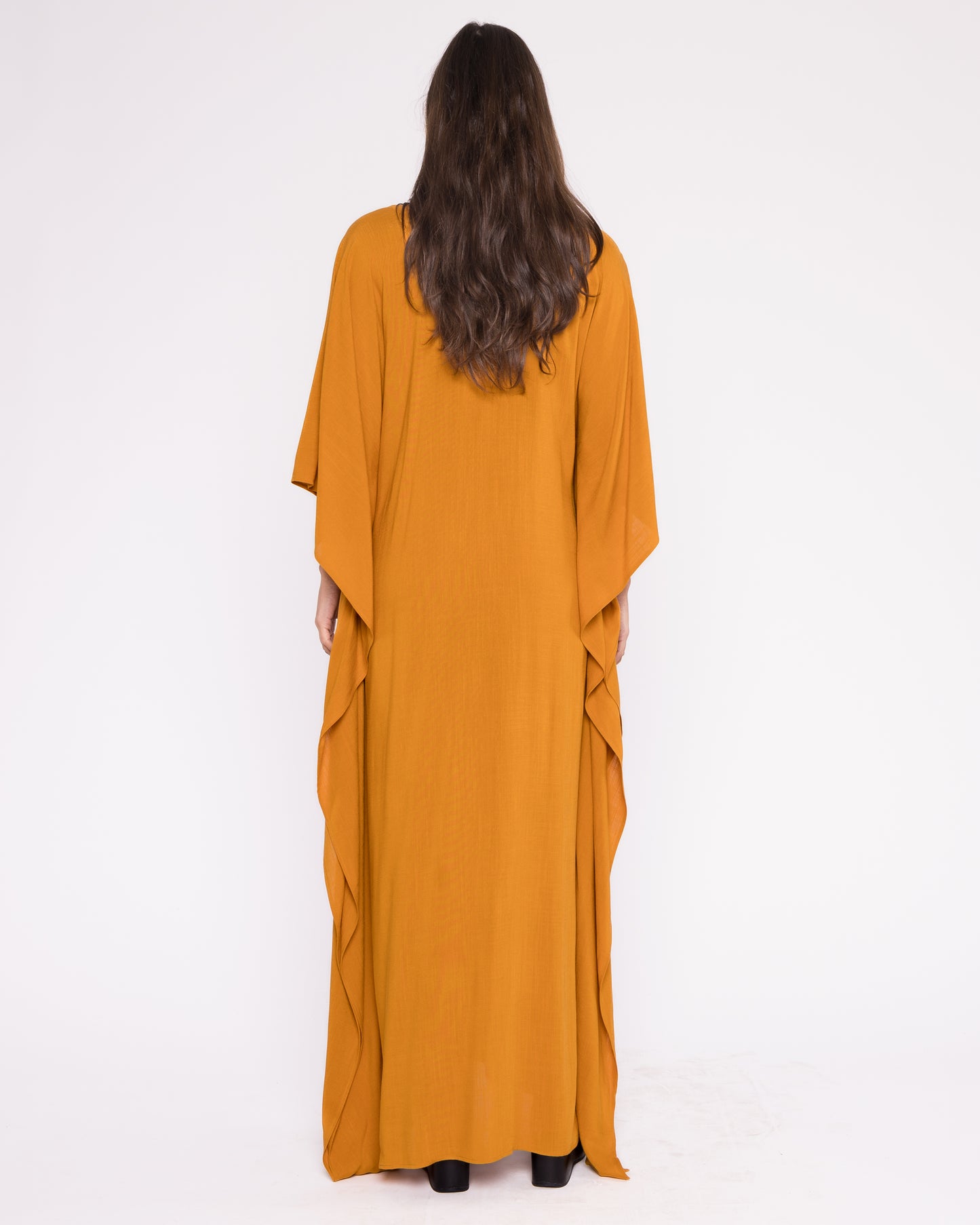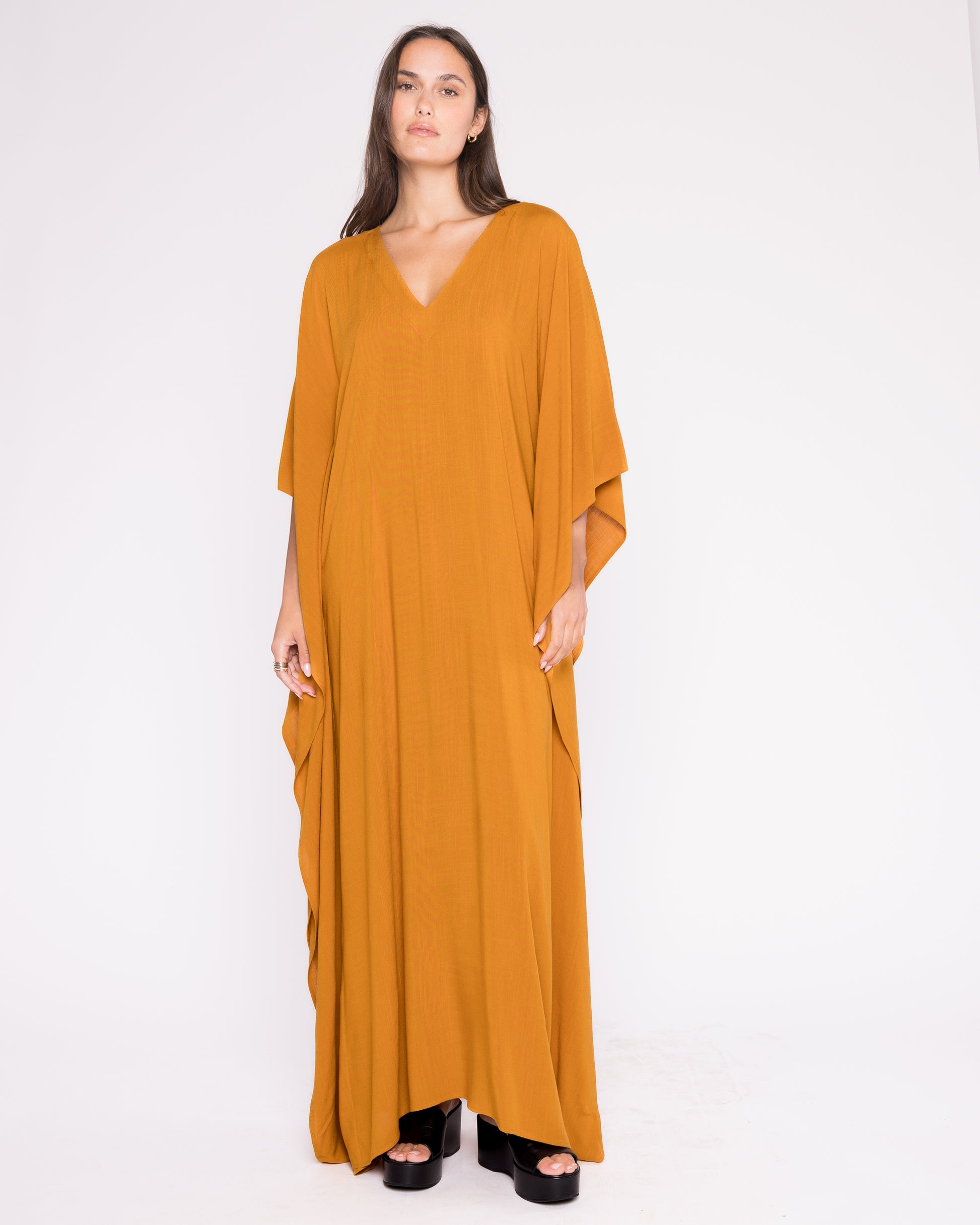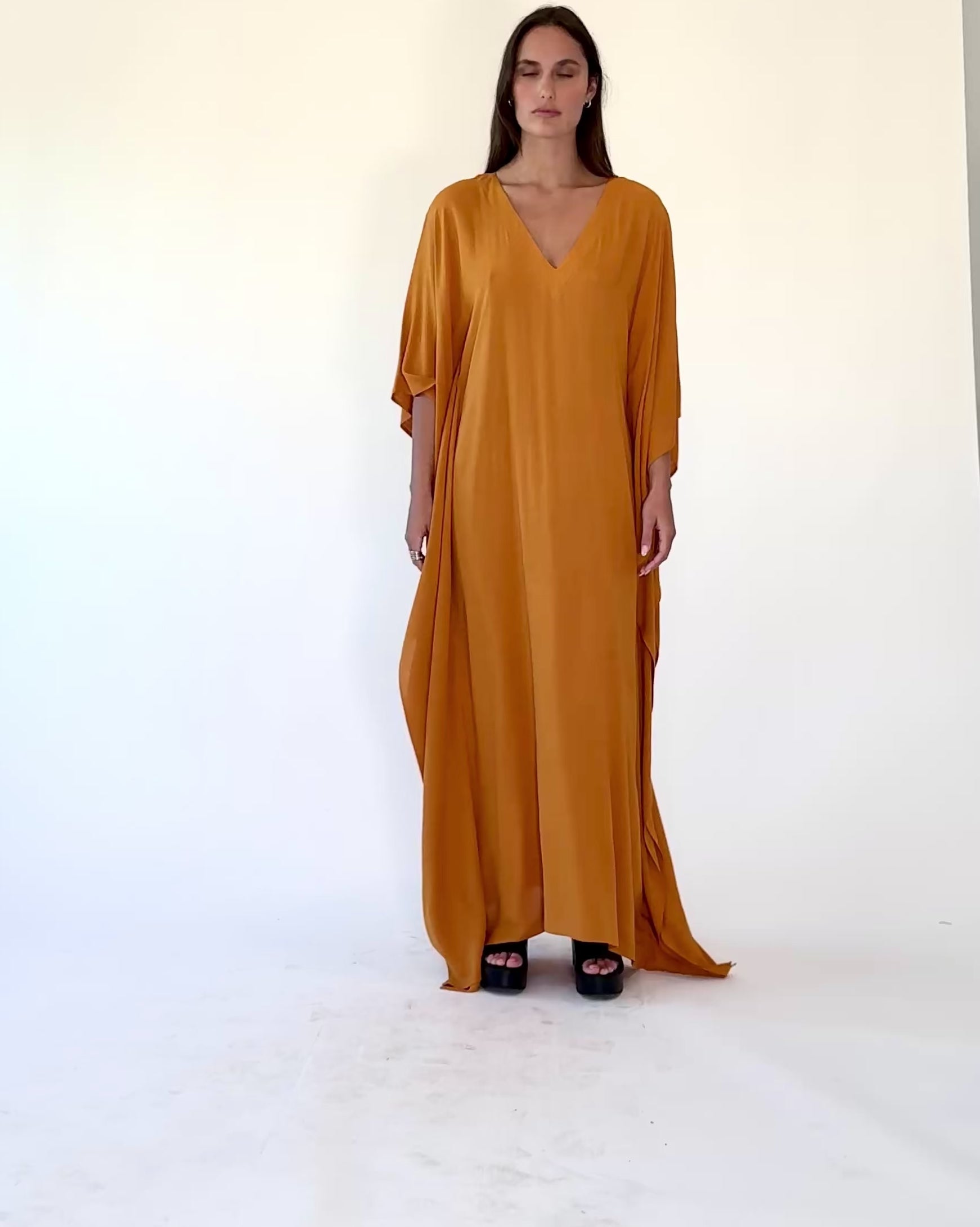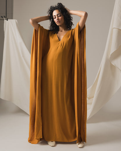 Effortless volume, understated elegance. This modern caftan is cut from a soft, breathable linen blend that drapes beautifully with just the right amount of structure. With its voluminous silhouette, subtle V-neckline, and minimalist lines, it delivers timeless ease — whether at home, by the sea, or out for cocktails at sunset.