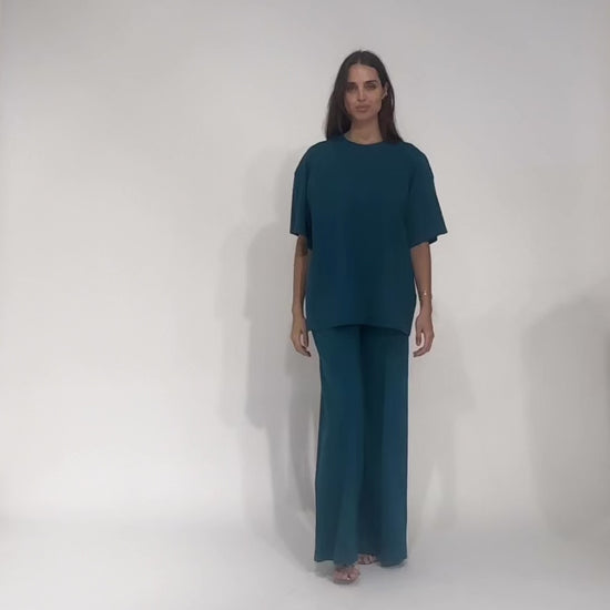 Bold proportion, effortless structure. Our short-sleeve shirt is reimagined in an oversized silhouette with sculptural lines and a relaxed fit. Designed to pair with our iconic wide-leg pants, it delivers quiet drama with modern minimalism.